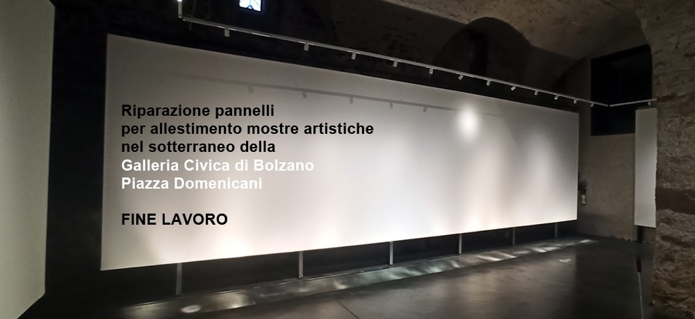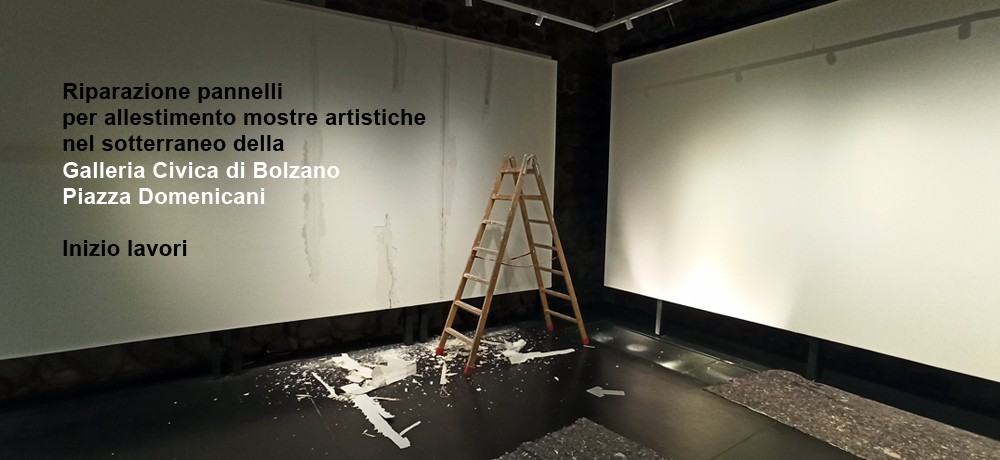 Galleria Civica di Bolzano - Piazza Domenicani Manutenzione e riparazione dei pannelli espositivi nel sotterraneo della Galleria Civica di Bolzano. Inizio lavori Stuccatura Stuccatura Stuccatura Asciugatura Lavori finito Lavori finito Lavori finito Prev: LAMPLHAUS (Ex Agnello) Comune di Bolzano Back to list Next: Tinteggiatura Galleria Walther